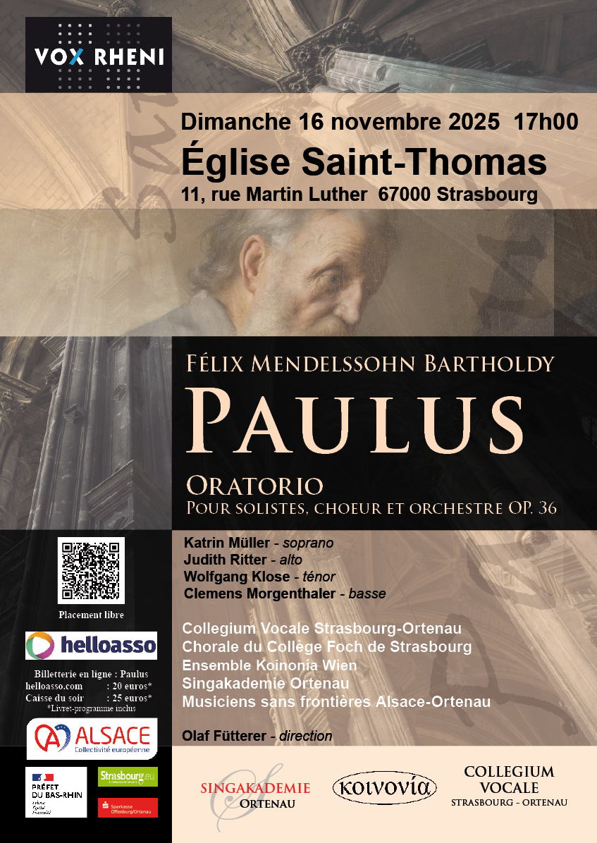On pourra l’entendre à nouveau, toujours dans ce même lieu à l’acoustique remarquable, où sera offerte au public colmarien une œuvre rarement jouée de ce côté du Rhin : l’oratorio Paulus, de Felix Mendelssohn-Bartholdy.